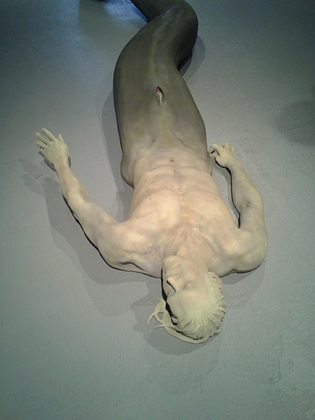 Back in December, I contributed to a Kickstarter project started by a sculptor named Cameron Stalheim who was working on his MFA thesis project, a 30-foot sculpture of a dying merman that he described as “the first in a new series of work that questions the relationship between fantasy, reality and the objectification that happens in between.” One eensy problem, though — since he would have to cast the model (fellow artist and adult film star Colby Keller) for the merman’s upper torso and casting materials are muy expensive, he needed outside funds to finish the project, hence the Kickstarter campaign.