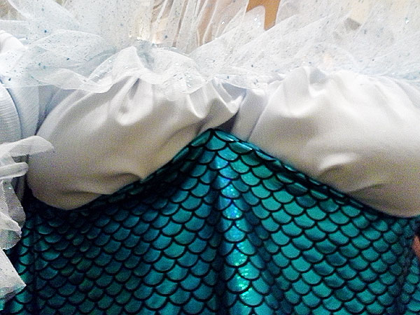 I couldn’t put on the whole thing (wig and makeup) because the cats picked that moment to go completely apeshit and start hissing and fighting all over the place, but this gives you an idea of what I’m working with. It’s not very clear unless I spread the skirt, but those are sparkly blue tulle fins on either side, and the white and gold rope trim close to the bottom of the skirt covers the marking line where I was supposed to put a bottom ruffle before I found out that 1) I didn’t have enough blue satin material and 2) the bustle material simply wouldn’t work that way (note for costumers — if you ever work with a foil material, be aware that you’ll need to stabilize it somehow, either by using a lightweight iron-on interfacing or doing a zigzag stitch along the edges, because that shit will tear apart at seams at a harsh word if it’s not reinforced). Que sera, sera. At least the trim looks nice, and I have pretty white fishnet stockings and gloves that will finish off the piece.