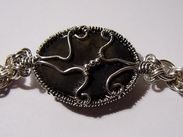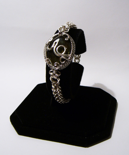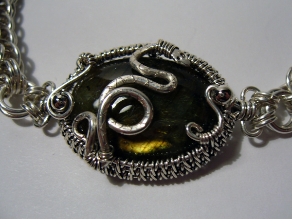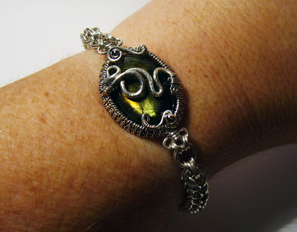 In addition, I just wanted to show this off. A friend of mine saw the cabs I was wrapped and asked if the labradorite had been spoken for yet. When I said no, he asked if I could do a Slytherin-themed bracelet in sterling with it (“with reptilian wrappings,” he specified).