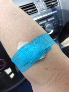 As for the blood pull, that was a bit of an adventure since the lab said they didn’t have paperwork for it. Went home because I was fasting and hangry as hell and called the doc’s office: “What? But we sent them the request!” Went back to the lab today: “Nope, we don’t have paperwork for this.” Finally went BACK to the doctor’s office, got them to print out the orders, then hand-carried them over to the lab to get everything kicked off. Oh, and once again I was a phlebotomist’s nightmare. Here are attempts #1 and #2, after 48 oz of water, and with the poor tech muttering, “Man, this vein just does NOT want to cooperate…” I told her the story of the time when I tried to donate blood and how they told me, “Please don’t.”