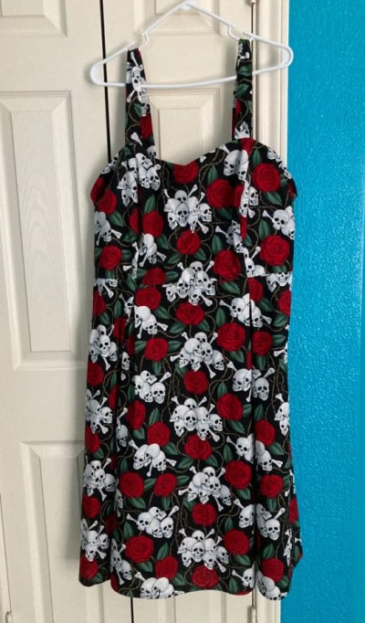 At right is my latest finished project, my Skulls and Roses swing dress. Now, I love swing dresses. They look great on me and I have three of them from Torrid, so when I found this awesome fabric I knew I wanted to make a swing dress out of it. I found one of those “designed to be adjustable” patterns that give you more than enough seam allowance so that you can baste the dress together and fit it to yourself before actually sewing everything, and I must have cut the actual pieces out three or four years ago.