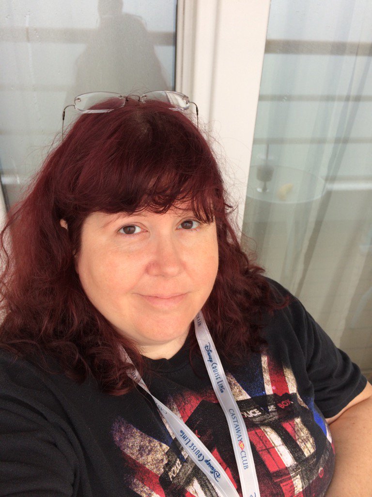 So, yeah, Ramón and I were on our much delayed and badly needed vacation last week (that’s a very bleary me at right after sneaking out for an early breakfast while the ship was still stuck in the Galveston port due to fog), hence my absence from the Internet in general and a lack of posts on this blog. Although I’m not sure I can classify it as a vacation seeing as I was editing Intersection every day, but editing a book on a nice Disney cruise ship where a friendly man brings you drinks on request is without a doubt much better than doing it at home with five cats demanding your attention in shifts while the weather tries to blow the top of your head off with a migraine.