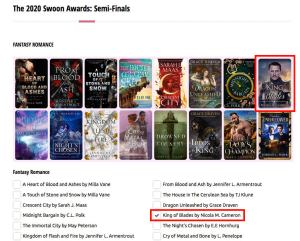 There’s a new contest in Romancelandia! The Swoon Awards are chosen by popular vote and are open to all romance readers. Much to my shock and delight, I found out that King of Blades made it into the semi-final round for the Fantasy Romance category.