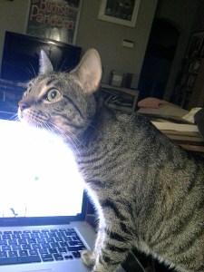 But I miss the healthy young cat who would follow me from room to room, who would curl up at the foot of the mattress while I slept, who would stay by my side when someone came to the door, ready to leap on the interloper if they tried to hurt me. He wasn’t a lap cat and didn’t like being picked up or held until his later years, but he would sit on the back or arm of my chair and just hang out with me while I wrote or watched TV.
