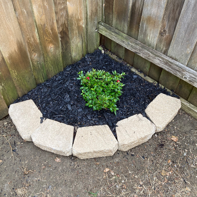 So I bought a small azalea bush with red blossoms, some shrub soil, additional lantana for the southern flower bed to replace the ones that got killed in the frost, then came home and put on my gardening clothes. I grabbed border stones from the little wall ringing the tree stump out front (will someone please remind me to have people come out this summer and grind out the danged thing?) and used those as a border, then dug a hole for the azalea bush, added the shrub soil and some mulch, and watered it.