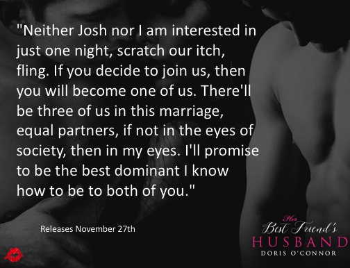 Today’s Sunday Shoutout goes to Doris O’Connor, whose hot new BDSM menage romance Her Husband’s Army Buddy is now available from Evernight Publishing and other purveyors of fine erotic romance. And now, here’s Doris!